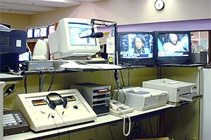 ![]() KFWB Anchor Studio Normally there were two news anchors in here. Shown here were Tracie Savage and Larry Carroll, well-known television news anchors. |