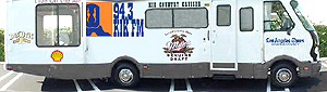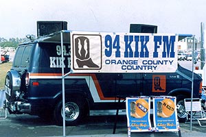 to put the carts in to. The next project was to plan for and move the offices and studios downstairs to the adjacent 2-story Financial Center, Suite 183. The photos on this page show this compact but very functional suite. Michael Means was Sales Manager and Station Manager for many years there and the station had its greatest success in the little Suite 183. I think it had about 1,850 square feet. In the early '90s, another 900 square feet was added next door, but we never cut through between the spaces. For about a year and a half in 1994-1996, KIK simulcast with the 94.3 in San Fernando, which was owned by Jack Siegal's Chagal Communications and LMA'ed to us. The synchronization system designed to lock the two signals together was not effective enough to eliminate the co-channel interference between them. The call letters during the LMA were KYKF and the offices were at the old KGIL Studios/AM transmitter site in North Hills, which was owned by Saul Levine. KYKF is now owned by the Libermans and broadcasts in Spanish with the call letters KBUA. Also during this time KIK's morning man was the legendary Charlie Tuna. He was a pleasure to work with, is the consummate professional and is very kind. For almost a year he broadcast his morning show from a tiny DJ booth at Universal Citywalk whose equipment was less than reliable. Then he did his show from the old KGIL Production studio that was part of the office space we were renting for KYKF. 1995 brought the addition of the KIK Country Cruiser, a 31-foot motor home whose rear bedroom I tore out and refit as a mobile studio. I worked on it mostly at home and my wife still tells everyone about having the mobile studio in our driveway for a month. In 1997, KIK-FM had to move to new digs because The City Shopping Center was shut down and the whole complex, except for the office building where the transmitter is, was being torn down to be replaced by The Block of Orange. After a lot of looking and space planning we found an 18,000 square foot space at 1045 S. East Street in Anaheim. This was large enough to accomodate about 2/3 of Art's cars (he had about 100 at the time), an antique radio museum and enough office space to cover any forseeable growth. The Control Room and Production Room were huge and look east out floor-to-ceiling glass. The station is still there today. It is a real showcase. KIK had some interesting and notable talent over the years in addition to Charlie Tuna. Gene Price spent several years in the morning slot. Lyle Kilgore did morning news in the early 80s. With his voice and delivery, he could skip a line of copy and you would think it was you. KIK first PD, Steve Thomas, had a lot of talent, but had less luck in his personal life. One night at the original Crazy Horse Saloon, he asked his wife to stand up and then introduced her as his "future ex-wife". When we were building out Suite 183, he ran an audio line from Art's office to his office. The line was never hooked up and Steve's end wound up inside a wall after the wall's location had to be changed. |
